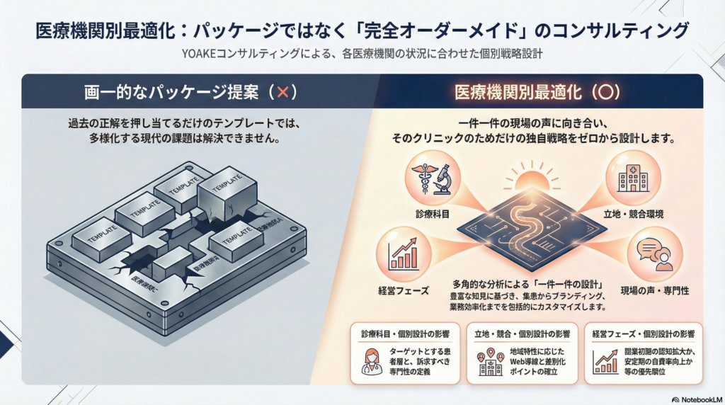 診療科目、立地、競合環境、経営フェーズは医療機関ごとに異なります。
